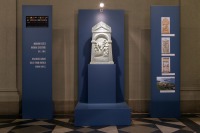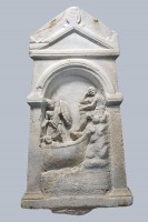 Az Antik Gyűjtemény szép ajándékot kapott századik születésnapjára az Oktatási és Kulturális Minisztériumtól: egy márvány domborművet. A darab műkereskedelemből került a Múzeumba, előtte pedig - legalább fél évszázad óta - angol magángyűjteményben őrizték. Alsó és felső szélén két-két rozsdás elszíneződés jelzi, hogy négy vaskapoccsal falra volt erősítve; oldalán körben kétféle modern festés nyomai és egy nagyobb repedést elfedő habarcsréteg maradványai tanusítják újkori történetének néhány szakaszát. A darab hátoldalát, amelyen jól láthatók a durva faragásra használt hegyesvéső nyomai, többhelyütt vastag, kemény meszes réteg borítja - eszerint tehát a relief hosszú időn át feküdhetett a földön, faragott oldalával lefelé fordítva.