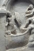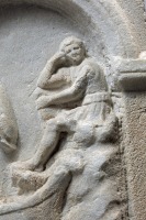 A dombormű jobb oldalára vértbe öltözött, a hajó fölé magasodó sziklán ülő ifjút faragtak. Testtartása nyugodt: bal lábát kinyújtja, a jobbot kissé felemeli; fejét a jobb kezére támasztja; szembefordul a nézővel - a gyászolók ábrázolásának egyik szokásos módja ez az antik művészetben.