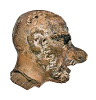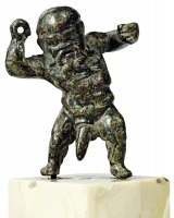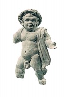 A kiállított kora-császárkori bronz törpe (14) azonban valószínűleg nem egy hétköznapi alak, hanem a pigmeusok mitikus, Afrikában élő népének tagja, akiket már az archaikus kortól legtöbbször a darvakkal vívott csatájuk közben ábrázoltak. Átfúrt kezeiben - a harcias póz alapján - eredetileg valamilyen fegyvert, baljában talán pajzsot tarthatott. Az eltúlzott, karikírozott jelleg a színháznak is sajátja. A maszk (15) hatása hasonló lehet, mint az eleve torz fejé (16); egyes maszk nélküli, de természetellenesen ágáló szobrokban mimos-színészeket sejthetünk, ugyanis ennek a klasszikus korban kialakult drámatípusnak a szereplői hétköznapi ruhában és maszk nélkül léptek föl.
