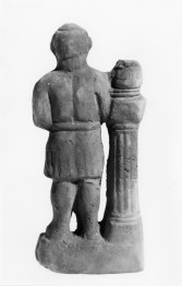 Világosvörös nílusi agyagból két formában mitázott figura, az oszlop tömör, az alapzat üreges. A szobrocska mereven frontális, csak elölnézetre komponált: a figura hátán hiányzik az elõoldalon látható ujjas tunika és a vállon átvetett kendõ. Az aránytalanul nagy fej, a hatalmas, tágra nyitott szem, a szakállborosta és a ruharedõk merev, mértani modellálása a késõantik szobrászat egy, a harmadik század végén feltûnõ sajátos stílusáramlatát tükrözi. A figura testtartása a gyászoló póza volt mind a görög, mind a Ptolemaios-kori egyiptomi szobrászatban. A vállon átvetett összehajtogatott kendõ és a figura melletti oszlopra elhelyezett edény elárulják, hogy az alak temetési lakoma résztvevõje lehetett. A temetéssel kapcsolatos szertartásokat és áldozatokat ábrázoló agyagszobrocskák a szegények halotti kultuszának dokumentumai: a szentélyekben felajánlott, vagy a sírban (a sírnál) elhelyezett terrakotta szoboralak maga volt a halotti áldozat, mely egyúttal az áldozat örökös mágikus megújulását is biztosította.