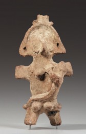 Ez az áldozati szobrocska közepesen finom, vörösszínû nílusi agyagból készült. Elõoldalát mintában formázták. Az ülõ nõalak ölében tartott gyermekét szoptatja, fején kicsiny Isis-jelvény látható, fülében átfúrt lyuk a fülbevalók számára. A nõ két karját imára emeli, lábai rövid tuskók, az arcot formáló lapos, félkör alakú korongból csak az orr emelkedik ki. Az ilyen típusú szobrocskák mint anya és gyermeke képei jelek voltak és nem ábrázolások, hiszen a formák végletesen leegyszerûsítettek. A termékenységért és anyaságért fohászkodó nõk amulettjeiként funkcionáltak, és ezt a szerepet tökéletesen betöltötték ilyen egyszerû formában is, hiszen az imádkozó tudta, mit ábrázol a szobor. Ezeket a szobrocskákat pogányok és keresztények valószínûleg egyaránt használták: a pogány egyiptomiak Isist és gyermekét, Hórust látták benne, a keresztények Máriát és Jézust.