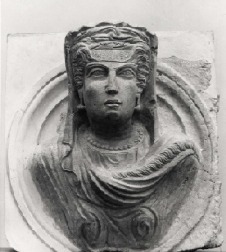 A mészkõbõl készült, medallionba foglalt, nõi büsztöt ábrázoló magas dombormû egy síremlékrõl származik. Az elölnézetben ábrázolt, fejét enyhén balra fordító nõalak fején turbánszerû fejdíszt, azon fátylat visel. Haja kétoldalt hátrafésült. Homlokát széles, gazdagon díszített diadém, fülét csüngõ fülbevaló, nyakát pedig gömbölyû gyöngyökbõl álló nyaklánc díszíti. Ruházata chitón, felette köpennyel. A fejtõl balra, a háttérben az egykori három vésett betû: BRT = lánya felirat, mára már megsemmisült. A dombormû a Kr.u. 3. század második felében készülhetett palmyrai mûhelyben, és a helyi, jellegzetes stílusú síremlékszobrászat gazdag sorozatába tartozik.