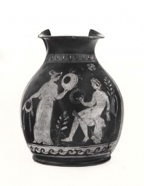 A lóhere alakú zömök, kisméretû oinochoé, más néven chous díszítése alapján apuliai mûhelyben készült. A vázának csak az elülsõ oldalát díszítették: a kétalakos kompozíció bal oldalán egy álló, ruhás nõalak látható, felemelt bal kezében tympanont, leeresztett és testétõl eltartott jobb kezében pedig egy szalagos koszorút tart. Vele szemben egy fejét szalaggal övezõ ruhátlan ifjú ül a köpenyén, elõrenyújtott jobb kezében koszorúval, leengedett baljában pedig babérággal, amely mögött egy függõlegesen hullámzó szalag látható. Az ifjú talpai és a babérág alatt futó vízszintes hullámvonalak talajvonalat jelezhetnek. A két alak között térkitöltõ motívumként egy leveles növény, az ifjúalak feje fölött pedig egy négyszirmú virágmotívum látható. A jelenetet felül nyelvminta, alul pedig futókutya motívum keretezi. Kétoldalt a képmezõt egyszerû kettõs függõleges vonal zárja le. A vázán gazdag a járulékos színek, ezen belül a fehér alkalmazása: fehér jelzi az ékszereket (a nõalak és az ifjú hajdíszeit, a nõalak nyakában a gyöngysort), a tympanon és a koszorúk részleteit, a növényeket és a nyelvminta belsõ nyelvét. A chous forma hagyományosan az athéni tavaszi Anthesteria ünnep harmadik napján a három év körüli gyermekek ünnepi ajándéka volt, ilyen formán Athénon kívüli megjelenése athéni betelepülõkrõl, az athéni hagyományok ápolásáról tanúskodik (mint pl. az euboiai Eretria esetében is).