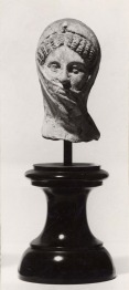 A nyak alatt letört fej egy középen elválasztott hajú, gerezdes frizurájú, köpenyes nõalakot ábrázol. A csak a homlokot és az arc felsõ részét szabadon hagyó köpeny befedi a fejet, és az orr alatt arc alsó felét. A hellénisztikus kori nõi tanagra figurák egyik elterjedt, köpenyes típusába tartozik. 4. századi típus.