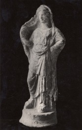 Két formából készült, alul nyitott, kerek talapzaton álló köpenyes nõt ábrázoló terrakotta. Hosszú, mell alatt összefogott chitónt, felette fejére húzott köpenyt (hymation) visel. A köpeny szélét felemelt, könyöknél behajlított jobb kezével oldalra vonja, behajlított bal keze könyökén nyugszik. A terrakottán jól megmaradt a fehér alapozóréteg, és azon a színezés. A darab az úgynevezett tanagra terrakották közé tartozik, és a 4. század közepén-második felében a késõ-klasszikus és kora-hellénisztikus idõszak fordulóján, boiótiai mûhelyben készülhetett.