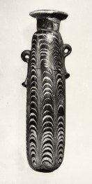 Homokmag technikával készült sötétkék színû íves alabastron az edény teljes felületén végighúzódó fehérszínû, vízszintes árkádmintába rendezett üvegszálakból álló díszítéssel. Az alabastron hosszúkás, enyhén ívelt formájú, rövid nyakkal és vízszintes, korong alakú peremmel. Az edénytest felsõ részén két kis kerek fül helyezkedik el, alattuk egy-egy kis dudor. Az edény az archaikus-klasszikus kori formai jellegzetességek (fülforma, dudor), és a késõbb, a hellénisztikus korban népszerûvé váló egyszínû fehér díszítése alapján a Kr.e 4. századra - 3. század elejére keltezhetõ, valószínûleg görög gyártmány.
