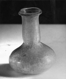 Világoszöld színû fújt üveg edény. A lapított aljon álló edény teste nyomott gömb alakú, hengeres nyaka a testhez képest hosszú és széles. A befelé keskenyedõ szájnyílás alatt egy profilált gyûrû fut körbe. Az illatszerek tárolására szolgáló edényke valószínûleg a Kr.u. 3. században készült.