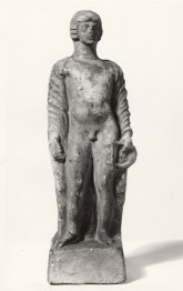 Két öntõformából készült, négyszögletes talapzaton, bal lábára nehezedve álló ifjú, leengedett bal kezében kitharával. Egyedüli ruházata a vállán átvetett, hátát fedõ köpeny (hymation), egyébként teste ruhátlan. Rövid haja oldalt vízszintes, széles hullámokba fésült. A test néhány pontján nyomokban megmaradt az eredeti vörös színû festés. A kitharás ifjú a kezében kakast tartó ifjúalak mellett (ld. a 37-es számú darabot) egy másik elterjedt klasszikus kori boiótiai típus, amelynek készítése szintén a Kr.e. 4. század elsõ felére tehetõ, és hasonlóképp nagy számban található meg a boiótiai és lokrisi klasszikus kori temetõk és szentélyek anyagában.
