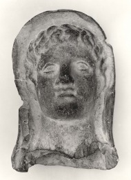 Negatív formából préselt, etruszk, szembenézõ ifjúfejet ábrázoló terrakotta. Az arcot a fejre húzott köpeny keretezi, amely alól kilátszanak a homlok hullámos fürtjei. Szentélybe áldozati ajándékként (ex voto) felajánlott tárgytípus, amely az etruszk mûvészeti hellénisztikus idõszakára, a Kr.e. 3. századra keltezhetõ.