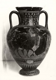 Vastag talpon ülõ ívesen felfelé szélesedõ, lapított tojásdad testû amphora belül profilált echinus-alakú szájjal és függõleges irányítású hármas osztású szalagfüllel. A váza felületét végig feketealakos díszítés borítja. A központi díszítést felül a nyakon és alatta, a váll felsõ részén, a test alsó harmadában és a képmezõ két oldalán, a fülek alatt ornamentális díszítés keretezi. A nyakon ellentett palmetta-lótuszsor motívum, alatta a váll tetején pedig váltakozva vörös és fekete színû kyma-sor fut körbe. A test alját félkör alakú, alul-felül indákkal összekötött lótuszbimbó sor, alatta pedig sugármotívum díszíti. A fülek alatt palmetta-lótusz kereszt minta látható. A váza mindkét oldalát dionysikus jelenet díszíti: az A oldalon a jelenet közepét a köpenybe öltözött, szakállas Dionysos foglalja el, kezében egyik attribútumával, a szõlõággal, mögötte pedig egy jobbra menõ kecskével. Két oldalán egy-egy, hosszú köpenyt viselõ mainas látható, a bal oldali kezében krotalát (csattogtatót) tart. A váza hátsó oldalát egy kecskén lovagló, kezében borostyánágat tartó, köpenyes mainas, elõtte egy másik futó köpenyes mainas díszíti. Mindkét oldali képmezõn a szabad helyet szõlõágak töltik ki rajtuk szõlõfürtökkel. A vázán az alakok fekete alapszíne mellett gazdag az egyéb járulékos színek használata. A fekete alakos vázafestészetben hagyományosan, így itt is fehér szín jelöli a ruha alól kilátszódó nõi testrészeket (karok, nyak, arc). Vörös színû festés jelzi Dionysos szakállát és a mainasok haját díszítõ hajszalagot. A budapesti amphorát az alakok belsõ részleteit jelzõ elnagyolt, hanyag bekarcolások, a zsúfolt kompozíció az athéni vázafestészet késõi feketealakos produkciójába, ezen belül pedig az idõszak legtermékenyebb mûhelyéhez, a Leagros-csoporthoz sorolja (attribúció). A váza a Leagros-csoport alkotói idõszakán belül pontosabban nem keltezhetõen, a Kr.e. 6. század utolsó negyedében készülhetett.