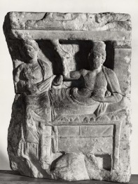 Lakoma-jelenet. Pillérek szegélyezte s fölül tagolt koronázó párkánnyal záruló naiskos, benne klinén fekvõ, szakállas férfi (hérós). Fején polos, vállát s alsótestét köpeny takarja; föltámasztott balkezében kis, lapos csésze, fölemelt jobbjában ivókürt (rhyton). Elõtte asztal áldozati ételekkel; az asztal alatt fekvõ kutya. A kliné végén szemköztnézetben ábrázolt, chitónba és himationba öltözött nõalak ül. Az asszony feje mellett balra négyszögû mezõben lófej maradványa. A dombormû bal oldala hiányzik. Hasonló darabok tanúsága szerint az asszony valószínûleg illatszert helyezett a jobbján feltételezhetõ füstölõre (thymiatérion), a dombormû bal szélén pedig a hérósnak tiszteletet adó, kisméretû alakok álhattak.