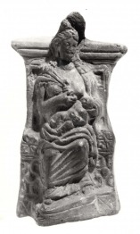 Finom, téglavörös nílusi agyagból két formában készült, hátul kidolgozatlan, üreges, alul nyitott szobrocska. A trónuson ülõ Isis istennõt ábrázolja, amint gyermekét, Hórust szoptatja. A trónus fejrészét kiszélesedõ párkányzat zárja le, hátoldalát az égetés elõtt bevésett kazetták díszítik, az oldallapok és a trónszék lábai szintén díszítettek. Az istennõ bokáig érõ chitónt és a vállán átvetett szalagot visel, hullámos fürtjeit középen választották el, majd a fül mögött hátrafésülték, a korona elveszett. Fejét kissé balra fordítja, lábát ferdén elhelyezett, egyik sarkával elõreugró zsámolyon nyugtatja. Bal keblébõl az ölében fekvõ Harpocratést szoptatja. A szoptató Isis (Isis lactans) ábrázolása fáraókori elõképekig nyúlik vissza: Isist és más istennõket (fõként Hathort) gyakran ábrázolták, amint a gyermekisteneket vagy a fáraót szoptatták. A Ptolemaios-korban a fáraókori típust hellénizáló ábrázolás váltotta fel: a kis terrakották feltehetõen az alexandriai és memphisi kultuszképmásokat utánozták. A típust gyakran lámpadíszként alkalmazták.