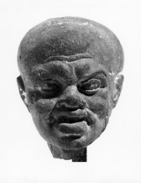 Finom, halvány téglavörös nílusi és márgás agyag keverékébõl két formában mintázott tömör szoborfej. Kopasz férfit ábrázol: széles, ráncos homloka van, vastag szemöldökét felvonja, fölötte nagy dudorok láthatók, pisze orra háromszög alakú, orrluka hangsúlyos. Szája kissé nyitva, az enyhén elõreugró alsó ajak kellemetlenné teszi arckifejezését. A részletek frissessége és gazdagsága arra enged következtetni, hogy a szobor az eredeti mintában készült, majd a mester utólag is igazított egyes részleteken. A típus jól ismert: a kopasz vénember karakterének jellegzetes példája groteszk és visszataszító vonásokkal. Elképzelhetõ, hogy a szobrocska színészt ábrázolt, vagy a Ptolemaiosok dionysosi kultuszában játszott szerepet.