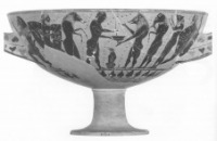 | Attikai feketealakos kylix. A fénykép forrása: A. Snodgrass, Homer and the Artists, Cambridge, 1998, 58, 24. k. | Magas talpon álló, széles szájú, kétfülű ivóedény, az egyik leggyakoribb boriváshoz használt edény-forma. A symposionok (lakomák) fontos kelléke, de használták a síroknál vagy szentélyekben bemutatott libatio céljára is. Kívül és belül egyaránt szívesen díszítették tálszerű felső részét. Az edény formájának megfelelően belsejében kör alakú képmezőben, külső oldalán pedig egy körbefutó sávban helyezték el a legtöbbször figurális díszítést. A forma előzményét már a mykénéi korból ismerjük. |