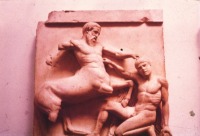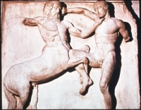 Név szerint csak néhány kentaurt ismerünk. Közülük az egyik Nessos, akivel Héraklésnek gyűlt meg a baja. Mikor hazafelé tartott ifjú feleségével, Déianeirával, egy folyóhoz értek, ahol Nessos kentaur töltötte be a révész tisztét. Elsőként Déianeirát vette a hátára, hogy átvigye a túlsó partra, de erőszakot akart elkövetni rajta, ezért Héraklés megölte. Elatos és Eurytión kentaurok szintén Héraklés ellenfelei voltak. Tudomásunk van azonban vendégszerető, barátságos kentaurokról is. Az egyik ilyen Pholos, a másik pedig Cheirón, az istenek fiainak és több hősnek is (pl. Achilleus, Iasón, Asklépios) nevelője, aki a gyógyítás képességével is rendelkezett. Irodalom: H. von Geisau, Der kleine Pauly (1969) 183-184. s.v. Kentauroi Kerényi K., Görög mitológia, Budapest. 1977. Birkás Éva 2004 |
