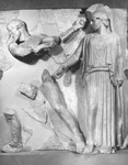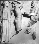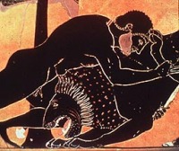 Munkái végeztével őrület szállta meg, és megölte a gyermekeit és a feleségét, azt képzelve, hogy Eurystheus hozzátartozói. Ezután még egy vendéggyilkosságot követett el: megölte az oichaliai Eurytos király fiát, Iphitost, a rajta Oichaliaban esett sérelmek miatt. Hogy vezekeljen vétkéért, három évig Omphalé lyd királynő szolgálatába kellett állnia. Korábban megmentette Oineus király lányát, Déianeirát erőszakos kérőjétől, Akhelóos folyamistentől. Ezzel elnyerte a lány kezét. Mikor hazafelé indult ifjú mátkájával, egy folyóhoz értek, ahol Nessos kentaur töltötte be a révész tisztjét. Elsőként Déianeirát vette a hátára, hogy átvigye a túlsó partra, de erőszakot akart elkövetni rajta, ezért Héraklés megölte. A kentaur nem halt meg azonnal, előtte sikerült rászednie Déianeirát. Arra biztatta, hogy fogja fel vérét, mert annak varázsereje van: Héraklés nem fog soha más nőbe beleszeretni, ha olyan inget hord, amit az ő vérével itattak át. Déianeira megfogadta a tanácsot. Hamarosan szükségét is látta, hogy felhasználja a kentaur ajándékát: Héraklés haddal elfoglalta Oikhaliát, megölte Eurytost, és annak lányát, Iolét a rabnőjévé tette. Déianeira Nessos vérébe áztatott köntöst küldött Héraklésnek, ami égetni kezdte a bőrét, mikor felvette, és nem tudta letépni a testéről. Végül máglyát készíttetett magának az Oita-hegyén, hogy a halálba menekülhessen. Tagjai azonban a lángok közt istenivé váltak, és Héraklés felkerült az olymposi istenek közé. Héra hozzáadta lányát, Hébét feleségül. Legjellemzőbb ábrázolásain a lenyúzott oroszlánbőrt viseli. Az oroszlán feje Héraklés fejét, a bőr a hátát fedi, a mancsok pedig elöl a mellkasán vannak megkötve. Gyakran látható még nála bunkósbot, íj, vagy ritkábban kard. Irodalom: Kerényi K., Görög mitológia, Budapest. 1977. H. Sichtermann, Enciclopedia dell'arte antica 3 (1960) 378-387. s.v. Eracle Birkás Éva 2004 |