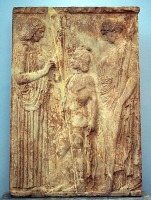 | | A Triptolemos-relief, Kr.e. 440-430 | A gabonaszemek átadásának pillanatát ábrázolja a híres háromalakos dombormű is, amelyet az Athéni Nemzeti Múzeumban, egy részleges másolatát a Metropolitan Museumban őriznek. Az Kr.e. 440-430 közé keltezhető reliefen Triptolemos Démétér és Koré között látható. Régészeti szempontból érdemes megemlíteni, hogy a gabonakalászok eredetileg bronzból készülhettek és csapok rögzítették őket a relief felszínéhez, valamint, hogy a domborművön Triptolemos kicsit fiatalabbként van ábrázolva mint a korabeli athéni vázaképeken. |