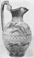 | Etruszk feketealakos oinochoé nyúlvadászat jelenetével. Seattle | Az oinochoé egy kancsóforma. A görög elnevezés "bortöltőt" jelent, funkcióját tekintve tehát bor felszolgálására használták. Az egyik legáltalánosabb és legváltozatosabb görög vázaforma. Több típusa van: a száj lehet lóhere alakú, kerek vagy csőrös; a nyak keskeny vagy széles, egyenes vagy ívelt; a test karcsú, zömök vagy gömbölyded. Leggyakoribb formája az tojásdad testű, lóhere-kiöntős típus, amely a Kr.e. 5. századi attikai vörösalakos vázafestészetben különösen kedvelt volt. A legkisebb típusú oinochoé, a chous, általában nem haladja meg a 20 cm-t. Ez a forma a Kr.e. 5. század végén jött divatba és gyakran gyermek-jelenetek díszítik. A vázafestészeti iskolák változásával tehát a különböző formák kedveltsége is változik. Előfordul, hogy az attikai vázafestészetben korábban már kihalt típus a dél-itáliai műhelyekben folytatódik.