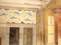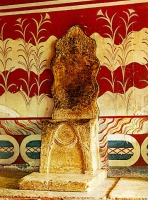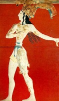 | | A "tollkoronás herceg" | Kréta északi partján épült fel a legnagyobb palota, melyet sokáig a többi krétai palota mintájának tartottak. A régészeti kutatások azonban bebizonyították, hogy nagyjából egy időben épült fel a többivel, tehát valószínűleg máshonnan, feltehetően Észak-Szíriából vettek át egy már korábban kész sémát, és azt alakították a saját igényeiknek megfelelően. Knóssost először Minos Kalokairinos krétai régész kezdte el ásni, majd Sir Arthur Evans (1851-1941) angol régész tárta fel 1900-tól kezdve több éven át, rádöbbentve a tudományos világot, hogy lézetett egy önálló minósi kultúra a mykénéi előtt, de ugyanakkor az ő elképzeléseit és rekonstrukciós munkáját a későbbi kutatások nem mindenben igazolták. Az egyik leghíresebb ilyen tévedése talán a "tollkoronás herceg" nevű freskó restaurálása: három töredékes freskóból rakta össze Evans, így alkotva meg egy teljesen új, a minósi időkben soha nem létezett ábrázolást.