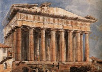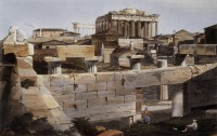 | 2. kép Az Akropolis 1800 körül. Az előtérben a Propylaia, hátul a Parthenón és a lakóházzá átalakított Erechtheion. Aquatinta festmény. (Forrás: E. Dodwell, Views in Greece, 1821). | Elginék 1800 júliusának végén érkeztek Hellasba. Athén ebben az időben kisváros volt: mindössze 500 görög, 400 török és 300 albán ház alkotta. A görögök és a törökök együttélése békés volt (1800-ban pl. a katonai és a polgári közigazgatás török vezetőjének, a vajdának és a disdarnak egyaránt görög felesége volt). Az Akropolisra (2. kép) ekkoriban nehéz volt belépési engedélyt szerezni, hiszen erőd volt, és itt voltak a tisztikar háremei is. Az engedély megadása a török hivatalnokok számára bevételi forrás volt, hiszen a belépést baksissal el lehetett intézni (fontos tudni: ez nem korrupciószámba ment, hanem a dolgok normális menete volt). Az épületek felállványozásról általában szó sem lehetett, holott ez nélkülözhetetlen volt pontos rajzok készítéséhez. Ráadásul mindehhez közvetlenül a Portától kellett engedélyt (fermán) szerezni. 1801. februárjában Lusieri elment Elginhez Konstantinápolyba. Ennek nyomán született meg az első fermán, bár ez ma már dokumentálhatatlan. Bárhogy volt is, Lusierinak visszatérte után még az állványoztatást is sikerült elintéznie, holott a fermán soha nem jutott el hozzá. Faragványok összegyűjtéséről ekkor még szó sem volt. Az Elgin-márványok történetének igazi kontextusát a napoleoni háborúk adják. 1801. márciusában brit expedíciós hadsereg szállt partra az abukiri öbölben. Június 27-én a brit-török csapatok elfoglalták Kairót (bár ennek híre csak július 18-án érkezett meg Konstantinápolyba); augusztus 31-én Alexandria is török kézre került. Ezekkel az eseményekkel párhuzamosan zajlott a márványok sorsa szempontjából döntő jelentőségű második fermán megadásának ügye. Elgin, a brit követ befolyása zenitjén állt. A hivatalos tolmács (dragomán) július 6-án értesítette Elgint: megszületett az engedély. A Porta nagyvonalúsága tehát nem utólagos, hanem párhuzamos volt: generálója a brit-török viszony szorosabbá tételére irányuló török szándék, ill. az első katonai sikerek hatása lehetett. A második fermánt Philipp Hunt, Elgin káplánja személyesen vitte Athénba, hogy biztosan megérkezzék. Az engedélynek három fő pontja volt: -szabad bejárást adott a citadellába (azaz az Akropolisra); -engedélyezte a rajz- és másolat-készítés szabadságát, ide értve a szabad állványozás, ásatás lehetőségét; -megengedte azoknak a szobroknak és feliratoknak az elvitelét, amelyek nem zavarják a falak szilárdságát, ill. az erődben folyó szokásos tevékenységet. Egy ilyen fermán érvénye azonban eleve korlátozott volt: keveset ért a helyi hatóságok jóindulata nélkül. Ezért a második fermán megbízott kiküldéséről is rendelkezik, akinek az volt a feladata, hogy a parancsnak érvényt szerezzen (ő volt Rasid aga, kormányzati kiküldött). Mindebből úgy látszik, Elgin eredetileg egyáltalán nem gondolta, hogy faragványokat is leszedhet az épületekről, hanem csakis a szanaszét heverő darabok összegyűjtését remélhette. Egy ilyen fermán azonban mindig értelmezés kérdése. A helyzetet később (1805-ben) világosan foglalta össze Hunt: "It (a ferman) even authorised them (Lusieri csapatának) to make excavations, and to secure for Lord Elgin any fragments of inscriptions or sculpture they might find. With such authority backed by the success of our arms at that moment in Egypt, I conceived that an extension might be given to the words of the ferman, which the Vaivode did not oppose..." Összegzésként: Elgin a Portának nyújtott brit segítségért hálából szabadon értelmezhető engedélyt kapott az Akropolison végzendő tevékenységére, és (Rasid aga kiküldésével) esélyt arra, hogy élhessen is ezzel az engedéllyel.