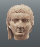 | | Tiberius császár (14-37) márvány portréja | Az építészet mellett és részben azzal összefüggésben a hivatalos művészet fő műfaja az udvar üzenetét birodalom-szerte mindenhová rövid idő alatt eljuttató pénzérméken kívül a történeti dombormű és a portré volt, az igényesebb művek anyaga túlnyomórészt márvány, amelyet a Kr. e. 1. századtól kezdtek kitermelni és így Itáliában is könnyen hozzáférhetővé tenni a lunii (ma carrarai) bányákban. A terem bal oldali hosszú falán ennek a két műfajnak reprezentatív példái állnak. Augustus utódának, Tiberiusnak (14-37) a portréját a hivatalos művészetben ekkor uralkodó klasszicizmus és az idealizált arcvonások száraz hűvössége jellemzi; a fejére húzott toga, az áldozók viselete, jámborságát van hivatva hangsúlyozni.