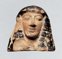 | Spártai terrakotta fej; Kr. e. 650-600. k. | A város melletti Apollón-szentély jellegzetes fogadalmi tárgya a keletről megtanult és hamar általánossá vált technikával negatív formából préselt agyag ifjúfej egyúttal bemutatja a keleti ösztönzések és a görög geometrikus hagyományok találkozásából a 7. században kialakult ún. daedalikus stílust, amelynek legszebb képviselői a görög nagyszobrászat első jelentős művei (l. a III. terem 3. tárlóját is). A Nápolyi-öböl nagy görög településén, Cumaeban talált feketemázas kenőcsös edényke a korinthosi gömbaryballos formájának spártai utánzata, a mellette kiállított kylix fülzónájának pontsora az egykori levélsorból egyszerűsödött a spártai kultúra virágkorának vége felé. A 6. század elejétől a század harmadik negyedének végéig az archaikus görög feketealakos vázafestészet jelentős iskolája működött a városban. Helyi edényformák használata, gyakran párhuzamok nélküli ikonográfia és díszítő ornamentika, kissé száraz, de eredeti rajzstílus jellemezte ezeket a vázákat, amelyek gyakran kerülnek elő távoli lelőhelyeken Samostól Egyiptomon és Kyrénén át a Spárta által alapított dél-itáliai Tarentumig. A jól felismerhető vázafestő-kezek közül a későbbiek és közepesek egyikétől, az ún. Lovas-festőtől vagy műhelytársától származik a tárlóban kiállított magas talpú csésze; a lakón feketealakos kerámiának ezt a legnépszerűbb edényformáját szokás szerint csak belsejében díszíti figurális festés: ezúttal a névadó lovas alakja két lóval, mögötte a ló hátán kis szirén-alakkal, esetleg a váza funeráris rendeltetésének jelzésére.