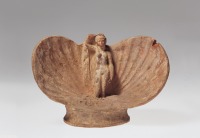 | | Aphrodité születése, korinthosi terrakotta szobor; Kr. e. 350-300 k. | A korszak kisművészeteit bemutató tárló bal oldalán hátul a két boiótiai terrakotta nőszobor a 4. század első feléből már jelzi az ízlésváltozást: a klasszikus kompozíciók méltóságát, nyugodt harmóniáját a ruharedők mozgalmasabb mintázása, a kezek élénkebb gesztusai kezdik feloldani. Boiótia ebben az időben elmaradott vidékből egy időre a görög félsziget vezető hatalma lett, de művészetében változatlanul egymás mellett élt egyfelől a két nőszobor által is példázott athéni hatás, ami lépéstartást jelentett a kor egyetemes görög művészetével, másfelől egy lokális igényeket kielégítő produkció. Ennek jellemző példája az 5. század végén felvirágzó, archaizáló technikájú helyi feketealakos vázafestészet, amelynek jellegzetes, a díszítést triviális növényi motívumokra korlátozó darabja a tárló jobb szélén a falon egy kylix és alatta egy fedeles pyxis. A madárral játszó két lány bal szélen kiállított zsánerszobrocskája korinthosi műhelyben készült, ugyanígy a tárló legjelentősebb darabja, a színész-szobrok melletti, lelőhelye szerint is korinthosi terrakotta szobor: a lába alatt plasztikusan jelzett tengerből kagyló belsejében gyöngyként fölmerülő Aphrodité ábrázolása (két lábfeje még a vízben van); a nagyhatású kompozíciónak a dél-itáliai görög művészetben is számos utánzata ismeretes.