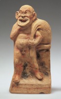 | Komédiaszínész athéni terrakotta szobra; Kr. e. 3. sz. | A klasszikus hagyomány megértő folytatója a bal oldalt elöl kiállított márványfej, amely az Athénhoz közeli Braurón Artemis szentélyében kultikus szolgálatot teljesítő, "medvék"-nek nevezett kislányok egyikét ábrázolja. Ugyancsak athéni műhelyben készült a kis márvány női fej, valamint a középen összegyűjtött színész-szobrocskák, a virtuóz agyagmintázás és a karakterábrázolás mesterművei; az alakok a görög színjátszás nagy korszakának tipikus jelmezeiben, elsősorban az athéni komédia ekkor kialakuló és sokáig továbbélő típus-álarcaiban (szolgák, dajka, teherbe esett lány, gonosz öregaszszony) jelennek meg. Némelyikük talán egy-egy híres előadás emlékét örökítette meg vásárlóik számára lakásukban, majd nem egyet a sírba is tulajdonosa mellé temettek. Jobbra tőlük a szarvasfej alakú ivóedény (rhyton) a kor terrakotta művészetének kiváló darabja; a fejet két formából, a szájtölcsért korongon mintázták, a kiöntőlyuk az állat szájában van; a talpatlan edényt magasba emelve, ezen a nyíláson keresztül kellett a tartalmát egy hajtásra kiinni. A perzsa művészetből átvett edénytípus az 5. században a görög művészetbe beáramló új keleti hatások egyik példája. Mögötte a kis oinochoé az egyiptomi technikát utánzó archaikus színes üvegpaszta edények (l. az I. terem 7. tárlóját) hagyományának folytatója. A 4. században a figurális vázafestészet túl volt fénykorán. A görög nagyfestészet ekkor már a festői kifejezés olyan eszközeit hódította meg, amelyekkel a kerámia nem tudott a siker reményével versenyre kelni. A tárló vázái a korszak elejéről, a század első negyedéből valók, és még szorosan kapcsolódnak a megelőző korszak művészetéhez.