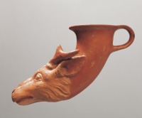 | Szarvasfej alakú görög agyag ivóedény; Kr. e. 4. sz. | A bal oldalt hátul álló, 400-390 körül készült nagy harang-kratér mestere a Meleagros-festő, a Dinos-festő monumentális irányának (l. az előző tárló nagy skyphosát) egyik utolsó jelentősebb folytatója vagy annak egy műhelytársa; a főoldal képe fáklyafény mellett fuvoláslány kíséretében mulatozó ifjak utcai felvonulása. A másik, nem sokkal későbbi nagy kratér, a róla elnevezett Budapest-csoportból, az 5. század végétől többnyire ifjúként ábrázolt Dionysost mutatja, lábánál párduc, vele szemben Niké, a Győzelem istennője, körülötte kísérői, szatírok és bacchánsnők; a körkompozícióként elképzelt jelenet a nagyfestészet térhatásaival próbál versenyezni, de a mélység jelzésére nincs más eszköze, mint a fehérrel jelzett talajvonalak az isten és a jobb oldali szatír lába alatt. Ezekkel a hagyomány szerint a szigorú stílus korának nagy festője, Polygnótos érzékeltette annak idején a harmadik dimenziót, az árnyékolás és a perspektivikus ábrázolás elterjedésének korában azonban csak a dekoratív zsúfoltság érzése lett az eredmény; a hátsó oldalt négy atléta egyszerűbb kompozíciója díszíti.
