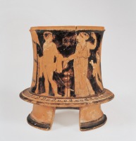 | Athéni vörösalakos harang-kratér, Dionysos és kísérői Nikével; Kr. e. 4. sz. eleje6 | Mindkét nagy kratér Franz Anton von Lamberg grófnak diplomata-szolgálata alatt az 1770-es években Nápolyban szerzett vázagyűjteményéből származik. A tárló bal szélén egy finom rajzú pyxis (fedele korábbi, eredetileg nem tartozott hozzá) az ekkor Dionysoshoz hasonlóan szintén ifjúként megjelenő Héraklés nászát ábrázolja. A tárgy jól illik a kozmetikai szerek tartására szánt edénytípushoz; a hérós görög szokás szerint a menyegzői fáklyák fénye mellett szüleitől a maga házába vezeti menyasszonyát, körülöttük Erósok és a menyasszony társnői. A festő ezúttal színekkel igyekezett a vázaképet a festészeti hatásokhoz közelíteni: az ajtótól balra a menyasszony fürdőjéhez használt lutrophoros-edényt hozó Erós, a másik, női ruhát vivő Erós és a földön álló két füstölő részleteit utólag feltett színek jelezték, amelyek mára jórészt eltűntek. A tárló jobb szélén egy kis harang-kratér ritka jelenete Aphrodité születését ábrázolja; az istennő kezében virág, előtte felé repülő Erós, koszorúval a kezében.