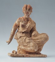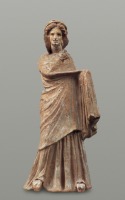 | Kockázó lány terrakotta szobra; Kr. e. 300-275 k. | A görög városállamok nem tudtak a maguk erejéből további fejlődésüket biztosító, életképes szövetséget vagy új államformát teremteni. Ezt csak az egymás közti szüntelen viszálykodásaikat kihasználó makedón uralkodó, II. Fülöp valósította meg, de egyúttal a görög városállamok függetlenségének is véget vetett. Fia, Nagy Sándor uralkodása alatt (335-323) a Görögországot meghódító makedónok a görögökkel együtt az egész Közel-Keletre kiterjesztették uralmukat. Nagy Sándor korai halála után ezen a hatalmas területen új birodalmak alakultak ki Kisázsiában, Előázsiában, Egyiptomban; kultúrájukat, amely a görög és helyi elemek találkozásából alakult ki, hellénisztikusnak nevezik, virágkora a hellénizmus kora (Kr. e. 330-30 között). A tárló anyaga és a terem végében levő szobrok sorozata ennek a korszaknak görög területen virágzó művészetét mutatja be (az itáliai és egyiptomi hellénisztikus művészet emlékei a III., illetve a megrendezés előtt álló VI. teremben láthatók). A görög anyaország kora-hellénisztikus kisszobrászata jórészt a praxitelési irány folytatója, Praxitelés költőisége nélkül. Jellemző emlékei a 4. század közepén Athénban felvirágzott agyagszobrászat ösztönzésére Boiótiában készült Tanagra-figurák a tárló bal szélén. Nevüket arról a boiótiai városról kapták, amelynek temetőjében rablóásatásokon az 1870-es években első nagy sorozatuk előkerült.