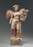 | Erós kitharával; Papias myrinai terrakotta szobra; Kr. e. 1. sz. második fele | A Tanagrákénál nyitottabb kompozíciójuk, erőteljesebb és gyakran durvább vonású mintázásuk, a jobb szélen bemutatott kis fejek groteszk, torz vagy patétikus kifejezése jórészt általánosan érvényesülő jelenségek a kornak a csúnyaságot is az esztétikai kategóriák közé emelő görög művészetében. A fejek mögött álló vagy eredeti elhelyezésüknek megfelelően a falra függesztett mozgalmas, olykor színpadias figurák többsége a kisázsiai Myrina, részben pedig Smyrna és a Fekete-tenger déli partján fekvő Samsun (az ókori Amisos) műhelyeiben készült, a bal kezében kitharát tartó Erós, mesterének a talapzatba bevésett monogramja alapján, alighanem a Kr. e. 1. század második felében. Ugyancsak a Kr. u. 1. századba is áthúzódó korszak végére vezet a mellette álló, oszlopra támaszkodó nőalak, valószínűleg Aphrodité, és alatta a győztes atlétaként ábrázolt Erós szobra, a késő-hellénisztikus korszakban mindinkább uralomra jutó klasszicizmus szellemében kiterített, egynézetű kompozíciójukkal. Az Erós-figura az Égei-tenger északi vidékének egy műhelyében készülhetett. A tárló vázái a 2. és 4. tárló agyag-, bronz- és üvegedényeivel együtt a klasszikus kor figurális vázafestészetének helyébe lépő formák és díszítésmódok példái. Balra a Tanagra-figurák alatti kratér és pyxis a hellénisztikus kornak egy széltében elterjedt, az athéni Akropolis nyugati lejtője alatti lelőhelyéről elnevezett kerámiacsoportjába tartozik, amelynek vázáit bekarcolással és a sötét mázra utólag feltett, járulékos festéssel díszítették.