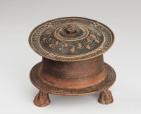 | Görög pyxis fedelén komédiamaszkkal; Kr. e. 3-2. sz. | A kratér, főoldalán arany nyaklánc ábrázolásával (a függők aranya jórészt lekopott) alighanem athéni műhelyben készült; a plasztikusan mintázott oroszlánmancsokon álló pyxis, amelynek fedelét a borostyáninda és a csoportra jellemző sakkminta közepén domborműves komédiamaszk díszíti, valószínűleg észak-görögországi munka a 2. század közepéről. Mögöttük egy finom ciprusi alabástrom kenőcsös edényke formája és anyaga miatt érdemel figyelmet. A Nagy Sándor-fejek alatt egy 2. század végi, ephesosi tál növénymintákkal a kerámia kedvelt új műfajának, a formatálból préselt, reliefekkel díszített edényeknek, az ún. megarai csészéknek finom példája; mellette a Kisázsia északi, Fekete-tengeri partján előkerült rhytonon (l. a 2.tárlót) az edénytest a szőlőfürt alakban tisztelt Dionysos (Dionysos Botrys) megjelenítése a 125-75 körüli évekből. A hellénisztikus művek sorát jobb szélen alul egy kiváló mestertől származó "hamisítvány" zárja be: praxitelési hellénisztikus stílust idéző kis modern bronz Aphrodité-fej, a 4. tárlóban látható diadémák ugyancsak aranyból készült utánzatával.