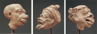 | Torz és groteszk terrakotta fejek Kis-Ázsiából; Kr. e. 2-1. sz. | A klasszikus hagyományok legfogékonyabb folytatója a tárlóban kiállított darabok közül a Chios szigetéről származó eredeti márvány Athéna-torzó. Mellette az ülő ifjú torzója római kori másolat; elcsavarodó felsőtestével a háromdimenziós kompozíciónak a késő-klasszikus kor harmadik nagy szobrásza, Lysippos művészetében megvalósult új lehetőségeit aknázza ki. Végső soron Lysippos Nagy Sándor-portréjára megy vissza a márványoktól jobbra egy márvány- és egy terrakotta-fej, amely sokadmagával a hellénisztikus kort megnyitó uralkodó halála után szinte mitikussá vált alakjának népszerűségét tanúsítja. (A Lysippos művészetét közvetlenebbül tükröző terrakotta Héraklés-szobrokat l. a III. terem 4. tárlójában.) A tárló közepén elöl kis zsánerszobrok csoportja a hétköznapok megjelenítésének új igényéről és a szabad csoportkompozícióknak a művészet alsóbb szintjén is közkinccsé válásáról vall. A jobb oldali terrakotta szobrok a hellénizmus későbbi szakaszában, a 2-1. században kisázsiai műhelyekben készültek.