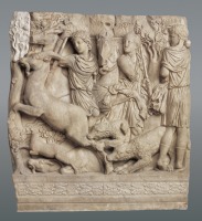 | | Athéni márvány szakofág oldala vadászjelenettel Salonából; 225-250 k. | A legjelentősebb mű, amely a görög kultúrájú provinciák művészetéből a kiállításon látható, a töredékeiből rekonstruált márványszarkofág. Athéni műhelyben készült a 3. század első felében, és arra utal, hogy Athén szobrászműhelyei ebben a korszakban nem maradtak el a kisázsiaiaktól. Görög szokás szerint a láda hátsó oldala is díszítve van, csak a fő- és a bal rövid oldalénál laposabb reliefekkel. A körben ábrázolt vadászjelenet hiányzó részeinek rekonstruálását a spliti múzeumban őrzött további töredékek figyelembe vétele teszi lehetővé (l. a vázlatot a falon). A motívumok hellénisztikus minták emlékét őrzik, a gazdag, zsúfolt kompozíció stílusa a távoli századokra visszanyúló athéni műhelyhagyomány szerves 3. századi folytatása. A domborművön semmi nem mutat arra, hogy mitológiai ábrázolás volna, bár ezt sem lehet kizárni; az értelmezés lényegét azonban ez nem érinti, a jelenetet az "örök vadászmezőkön" kell elképzelni. A kisázsiai és athéni szarkofág-faragó műhelyek a magánplasztika legigényesebb műfajának fő műveit produkálták, amelyeknek formája és stílusa a római szarkofág-művészetben is visszhangra talált. Az attikai szarkofágok egykorú értékelésére jellemző, hogy a birodalom olyan távoli vidékeire is eljutottak, mint Dél-Franciaország, Hispánia, Észak-Afrika, Szíria vagy a Fekete-tenger északi partvidéke; gyakoriak végig az Adriai-tenger keleti partvidékén; a budapesti szarkofág is itt, a dalmatiai Salonában került elő.