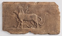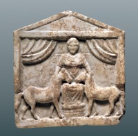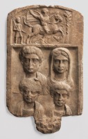 | Macedoniai márvány családi síremlék; 3. sz. első fele | A thrákok törzseinek fő települési helye azonban a Balkán-félsziget keleti középső része volt, a mai Bulgária és részben Románia, Macedónia, Görögország és Törökország területe. A rómaiak is több provinciára osztották, változó határokkal: Thracia, Alsó-Moesia, valamint Macedonia keleti része volt az a térség, amelynek bennszülött lakossága túlnyomórészt thrákokból állt. A terület, a közigazgatási provincia-határoktól függetlenül, vallásában és művészetében egységes vonásokat mutat; ez csak részben vonatkozik az Égei- és Fekete-tenger partján korábban alapított görög városokra, még kevésbé a római uralom nagy városi központjaira, amelyeknek kultúrája erősen romanizált volt. A thrákok római kori kultúrájának legjellemzőbb emlékei a márvány fogadalmi és sírdomborművek, amelyekről jó képet nyújtanak a hosszú falon az estei síremlék után kiállított példányok: három sírtábla, és a fal végén a kis fogadalmi domborműveket tartalmazó fali tárló bal oldalán három, részben töredékes fogadalmi relief. Az utóbbiakkal kezdve, kettőn közülük a tábla állítójának thrák név felirata egészíthető ki a fennmaradt betűkből, a fej-töredék fölé viszont modern felirat van bekarcolva; mind a három az ún. thrák lovasistent ábrázolja. Jelzőjét a lovas alak onnan kapta, hogy kultuszának, illetve ábrázolásainak középpontjában a thrákoktól lakott területek állnak. Kétségtelen, hogy a "thrák lovas isten" ábrázolásai mögött thrák vallásos elképzelések álltak, de ezeket írott források híján nem ismerjük pontosan. A thrák kultúra azok közé tartozik, amelyekben a bennszülött istenvilág figurális ábrázolása - éppúgy, mint Gallia nagy részén, Pannoniában, Daciában és máshol - csak a görög és római kultúrával való megismerkedés során terjedt el, és kapott többé-kevésbé kikristályosodott ikonográfiai formákat. A Venus-szobrocska a 2. tárlóban már utalt arra, hogy a thrák terület szoros kapcsolatban állt a kisázsiai görög partvidékkel. Minden jel szerint innen vették át azt a görög művészetben több évszázados múltú ikonográfiai típust, amelyben a "thrák lovasisten" az ábrázolásokon megjelenik: mint vágtató vagy lépő lovon ülő harcos vagy vadász, előtte gyakran oltárral és fával, amelyre kígyó csavarodik föl. Bár ezerszámra kerültek elő ilyen ábrázolások, főleg a birodalom-szerte a helyi vonások erősödését mutató 2-3. századból, az isten kilétét nem lehet egyértelműen meghatározni; hol különböző görög istenek (Apollón, Dionysos, Asklépios, stb.) jelvényeit viseli, és a táblák felirata is ezekkel azonosítja, hol egy-egy hely védőistene, hol számunkra érthetetlen thrák melléknevet kap, s igen gyakran hérósnak nevezik. Mindezek a thrák istenség egy-egy vonását jelenthetik. Nyilván főként hérós-jellege miatt került gyakran a síremlékekre. A hosszú falon két ilyen, Macedoniából származó márvány sírtábla áll a "thrák lovasisten" ábrázolásával. A fali domborművek sorában a harmadik a bennszülött lakosság romanizációjának jellemző példája; felirata szerint "Gaius, aki Kerdólas is, (állította) fiának, Verusnak emlékül", az apa tehát még thrák nevét is viselte, az elhunyt fiút már csak római nevén említik; a dombormű thrák lovasa talán az ő héróizált, a lovasistennel azonosult alakja, s a vadkanvadászatot hasonlóan kell értelmezni, mint az attikai szarkofág ábrázolását.