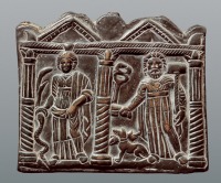 | | Bronz fogadalmi tábla istenpár ábrázolásával római provinciális műhelyből; 2-3. sz. | A kultikus fogadalmi domborművek között nem ritkák az olyan típusok, amelyek a birodalom görögül és latinul író felének határán fekvő balkáni és dunai provinciák közös jellemzői. Ilyenek a már bemutatott, "thrák lovas"-reliefek, amelyek Pannoniába is eljutottak, és többnyire ilyenek a hosszú falat záró táblán összegyűjtött további kis fogadalmi domborművek, a bennszülött vallásosság igénytelen kivitelű emlékei. Fönt jobbra egy töredékes márványtábla az elnevezésükkel elterjedési területükre utaló "dunai lovasistenek" kultuszának jellegzetes dokumentuma. Két fölső sarkában Sol és Luna, a Nap és a Hold mellképe; a főjelenetben a középen ülő anyaistennő, feje körül két oldalt kígyóval, valamint tőle jobbra és balra egy-egy lovasisten görög képtípusok felhasználásával a helyi mitológia ismeretlen nevű alakjait jeleníti meg; a tábla alján lakomajelenet töredéke maradt fenn. A relieftípus virágkora a 3-4. század, tömeges elterjedésének területe Dacia, Pannonia és a két Moesia; a mindig igénytelen kivitelű és kisméretű táblák főként a szegényebb lakosság körében elterjedt kultuszra vallanak. A két bronzrelief ugyancsak a görög-római mitológia ikonográfiájának felhasználásával ábrázol számunkra közelebbről ismeretlen helyi isteneket; a kisebb tábla istennője jogart és fáklyát tart, akár a görög Démétér, a másikon a kígyót itató istennő a görög Hygieia attribútumaival van ábrázolva, férfi párja kezében kulcsot, kalapácsot és kígyó-pártól befont hírnökpálcát, Hermés-Mercurius jelvényét tartja, lábánál az Alvilág bejáratát őrző háromfejű kutya, a Kerberos ül; a kísérő motívumoknak ez az együttese egyetlen klasszikus istenalakhoz sem illik teljesen. A két bronztáblához hasonló darabok stílusa és lelőhelyei ugyanarra a területre utalnak, amelyen a dunai lovasistent tisztelték. Egy valószínűnek tűnő feltevés szerint pozitív minták, patrixok voltak, és a róluk vett negatív formákból sokszorosították olcsóbb anyagban a fogadalmi lapokat.