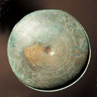| Föníciai bronz tál bekarcolt szfinxekkel; Kr. e. 700-650 k. | A tárló jobb oldalán a főníciai tárgyak kis csoportja van kiállítva. A főníciaiak eredeti lakóhelye Előázsia nyugati partvidéke volt, főként a mai Libanon területe. Nem alkottak szervezett államot vagy szövetséget, lakóterületük határait nem tudjuk pontosan megjelölni, és az elnevezést tágabb értelemben is használták az ókori szerzők. Ismerjük azonban a kánaáni csoportba tartozó sémita nyelvüket, írásukat, amelynek írásjeleit görög közvetítéssel máig használjuk, és jellemző életformájukat: elsősorban tengeri hajósok voltak, akik fémek után kutatva legkésőbb a Kr. e. 11. századtól egyre gyakrabban indultak felfedező utakra a Földközi-tenger medencéjében és rövidesen azon is túl; kereskedőiknek és kézműveseiknek főleg a 9. századtól meghatározó közvetítő szerepük volt egyfelől Egyiptom és a Közel-Kelet nagy kultúrái, másfelől Görögország, Itália és az Ibér-félsziget között. Hosszútávú útjaik megkönnyítésére és biztosítására terület-foglalási igény nélkül kikötők körüli állomásokat szerveztek Cipruson, Krétán, Dél-Itáliában, Szicíliában, Szardíniában; a 9. század vége felé ugyanilyen rendeltetéssel alapították az észak-afrikai parton többek közt Karthágót, és több állomáshelyet az Ibér-félsziget déli partján. Művészetük, bár nem volt teljesen híján eredeti vonásoknak, elsősorban a velük kapcsolatban álló, fennhatóságukat gyakran rájuk is kiterjesztő szomszédos nagy kultúrák tárgy- és képtípusait, stílusait dolgozta fel és olvasztotta egybe. Fémművességük legkorábbi bemutatott emléke a 7. századi bronztál, belsejében kiterjesztett szárnyú szfinxek bekarcolt rajzával, talán Mezopotámiába települt mestertől. Hasonló és főleg jóval igényesebb fémedényeiknek nagy szerepük volt az orientalizáló művészet kialakulásában Görögországban és Itáliában (l. az I. terem 4-7. tárlóját és itt a 10. tárlót). A tálka alatti három 6-5. századi vésett pecsétlőkő alakját az egyiptomi skarabeusoktól kölcsönözték, ábrázolásuk tárgyát is az egyiptomi vallás képvilágából vették (l. erről részletesebben a VI. teremben és az Egyiptomi Kiállításon): a bal oldalin Hóros sólyom alakban jelenik meg, lótuszvirágon ülve, fején napkoronával, előtte ureus-kígyóval, a középsőn ugyanő gyermek alakban ül lótuszkehelyben, ujja az ajkán, fején az egyiptomi kettős korona, a jobb oldalin Bés isten látható vállán gödölyével, előtte fejjel lefelé lógó malaccal, a görög szatírok arcvonásaival. Ez utal arra, hogy a művészeti kapcsolat a görögökkel kölcsönös volt.