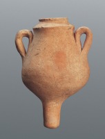| Pún agyagamphora; Kr. e. 4-3. sz. | Elöl a főníciai feliratú mészkő fogadalmi tábla, Tanitnak mint "Baal Hammon isten arcának", vagyis az 5. századtól Karthágó fő isten-párjának szóló dedikáció-formulával, a 4-3. században széltében megjelenő szegényes típus példája. A tárló bal oldalán a hellénisztikus kori pún kerámia emlékei állnak. Egy részük, mint a plasztikusan mintázott mellekkel díszített kancsó, sajátosan pún formájú, mások a görög kultúra mind jobban erősödő hatását mutatják, így a kis zömök típusú lékythos és a benyomott bélyegzővel díszített tál, a fekete máz silány utánzatával, vagy a hellénisztikus korban divatos görög fületlen kenőcsös edénykék (unguentariumok) két helyi változata. Bal oldalt elöl egy csomóban pún agyag parittyagolyók láthatók; a szabvány méretű tojásdad golyókból több ezret találtak Karthágó fegyverraktárában, amelyet a város elpusztításakor, 146-ban a rómaiak dúltak fel. A tárló baloldali falán bemutatott bronz férfi- és bika-alak az Ibér-félsziget déli és keleti részén élt, közös néven ibérnek nevezett bennszülött lakosság művészetének létezését jelzi. Hasonló kisbronzokat ezrével helyeztek a szentélyekbe fogadalmi ajándékul; készítésük virágkora az 5-2. század volt. A tárló mellett külön kiállított nagy edény tárlóamphora; ilyenekben tartották a bort, olajat, gabonát, és jórészt ezekkel rakták meg a búvár-ásatásokon előkerülő kereskedőhajókat. A típusnak ez a pún változata a római hódítást közvetlenül megelőző időkben alakult ki.