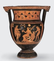 Apuliai görög vörösalakos oszlopkratér samnis öltözetű ifjú fogadásával; Kr. e. 4. sz. közepe