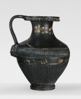 A tömegesen és változatos formákban készített feketemázas, gyakran fémformákat utánzó edényekből csak mutatóban áll egy a tárló bejárat felőli oldalán az emelvény alatt. Nemcsak bordázata és a máz csillogása, hanem formája is fémedényekre utal, bár nem ismerjük fém-mintaképét. Ez az epichysisnek nevezett, elsősorban talán kozmetikai célokra használt, de mécses-töltésre is alkalmas edényforma, amelyet különböző technikákkal díszítettek (l. a 8. tárlót), minden jel szerint Apuliában született, bár Görögországban is találták néhány példányát (esetleg utánzatait). A kiöntő két oldalát díszítő plasztikus női fej gyakran jelenik meg különböző típusú vázákon, így az epichysis melletti perzsa-fej alakú figurális kancsón, amelynek keletről átvett formája az 5. század végén tűnt fel rövid időre az athéni kerámiában, nyakán vörösalakos díszítéssel. Az apuliai példány a 4. század második felében készült, eredeti festésének nem maradt nyoma.