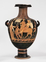 | | Campaniai görög vörösalakos hydria samnis harcos fogadásával; Kr. e. 320 k. | Campania a 8. századtól a praerómai Itália valamennyi kultúrájára kiterjedő hatású két nagyhatalom, a nyugati görögök és az etruszkok versengésének színhelye volt. (L. a 9. és 10. tárlónál és a térképet a szicíliai tárlótól balra a falon.) A Nápolyi-öböl partjának görög településeit, középpontjukban Cumaeval, az etruszk hatalmi zóna széles félköríve vette körül a legnagyobb etruszkizált várostól, Capuától a Salerno melletti Frattéig és Pontecagnanóig. Az Appenninekben élő italikus, elsősorban samnis törzsek az 5. századtól kezdték meg erőteljes mozgásukat a tengerpart felé, amelynek során a lucanusok és campanusok népcsoportja kialakult. Az 5. század utolsó negyedében elfoglalták vagy hatalmuk alá vetették szinte az egész Campaniát, benne Capuát és Cumaet, és csak a samnis háborúk győztes befejezése után, a 3. század elején vették át tőlük uralmát a rómaiak. A campaniai vörösalakos vázafestészet élete, akárcsak a paestumié, az említett oszk nyelvű népek uralmának korszakára esik; két központja Capua és Cumae volt. A tárlóban mindkét iskola képviselve van. Általánosan jellemző a campaniai vörösalakos vázákra - ellentétben a lucaniaiakkal - az élénk fedőszínek használata, és az apuliai-lucaniai ág műhelyeiben kedveltektől eltérő vázaformák, mint az itt túlnyomó többségre jutott harang-kratér mellett a középen emelvényen álló két nyújtott ovoid testű amphora és mellettük a fal felőli oldalon a kis felfüggeszthető kancsó (situla), amelynek csak Campaniából ismert formája az archaikus korig visszanyúló helyi hagyományt őriz. Campaniai sajátság az apuliai és lucaniai vázák klasszicizáló palmettáival szemben a fülek alatti "palmetta-fák" növénydíszének fantasztikus burjánzása (l. a két középső amphorát és a kis situlát), az ikonográfia típustárában pedig feltűnő a Dionysossal kapcsolatos motívumok szinte elenyésző ritkasága és az alakok gyakori samnis viselete. Az említett két nagy iskola közül a capuai korábban alakult, de a kiállításon ennek is csak a 4. század közepe utáni képviselői láthatók: a két nagy amphora, az emelvény két oldalán az öt közül négy hydria, a tárló egyik végében a kis skyphos, a másikban egy harang-kratér; a többi vörös-alakos váza Cumaeban készült. A nagy vázák rendeltetése túlnyomórészt sírbatétel volt, ábrázolásaik közvetlenül vagy közvetve erre utalnak. A bejárat felőli oldalon jobbról az első hydriát két samnis fegyverzetű harcos párviadalának jelenete díszíti (a fehérrel a fekete mázra festett lándzsák eltűntek, a többi fegyver fehér színe azt jelzi, hogy fémből vannak). Az antik hagyomány szerint a római gladiátori játékok Campaniából származtak, és eredetileg kultikus jelentésűek, halotti áldozatok voltak. A hydria ezt az áldozatot pótolja annak a vázára festett ábrázolásával: a pár síroszlop körül csap össze, és a jobb oldali harcos lába alatt a sírdomb is jelezve van; ő lesz a vesztes, kiömlő vére a sírdombon keresztül jut el áldozatként a halotthoz. A középső hydrián a görög művészetből jól ismert kentaur-harcban samnis viseletű harcos ad halálos döfést a kentaurnak; érdekes a váll virág-motívumának festői kidolgozása, még inkább a színhely és az idő nyilván jelképesen értendő jelzése egy fával, amelybe a kentaur kapaszkodik, és fölöttük a sugárzó, lemenőben levő fél napkoronggal. Szimbolikus kép díszíti a bal oldali hydriát is: Niké, a győzelem istennője, kezében kézidobbal, mint a diadalmas halál (mors triumphans) megtestesítője. A tárló másik oldalán a capuai hydriát a párducfogatot hajtó Erós ritka ábrázolása díszíti. Az emelvény két campaniai típusú amphorájának sírjelenetei közül a bal oldali a Roccanova-festő lucaniai amphorájáról már ismert halotti áldozat az oldalnézetben ábrázolt sírtábla előtt. A másikon palmetta alakú síremlék lépcsőjén ül egy gyászba borult nőalak: a fehér szín a márványt jelzi, a palmettalevelek sárga körvonalai azt, hogy reliefben kidolgozva kell elképzelni őket. A gyászoló nő alakjának mintája a szigorú stílusú görög művészet egyik ismert szobortípusa. A héróikus ruhátlanságban álló ifjú mindkét vázán a láthatatlan ábrázolása: az áldozó és gyászoló nem látja a halottat, csak a váza nézője. A tárlónak a IV. terem felé néző végében a harang-kratér fő oldalán Niké két kezében strigilist (l. a Roccanova-festő vázáját) tartó győztes atlétát koszorúz meg; a rajz a capuai és az egész dél-itáliai vörösalakos vázafestészet legvégső korszakába vezet, a 300 körüli évekbe, mikor a rajzolás klasszikus hagyományai teljesen feledésbe mentek. A cumaei vázák közül az előbbi mellett emelvényen álló harang-kratér a műhelyalapító CA-festő munkája. A főoldal finom rajzú jelenete a már ismert téma változata: a samnis fegyverzetű harcost búcsúztató nőalak a halottnak nyújt síroszlopánál italáldozatot; hasonló értelmű a hátsó oldal képe is. A kratér mögötti kis halas tál a típus campaniai változata (l. az 5. tárlót).