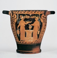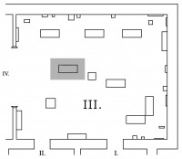 | | Campaniai vörösalakos skyphos, áldozó nők oltárnál; Kr. e. 330-320 k. | A tárló leghíresebb darabja az amphorák alatt a tárló fal felé néző oldalán kiállított hydria, az ún. LNO-festőtől; a harcos fogadásának (vagy ezzel egyértelmű búcsúztatásának) jelenetében mindhárom szereplő, a nőalak éppúgy, mint a harcos és lovásza samnis viseletben van ábrázolva. A fehér ezúttal a női testszínnek a görög feketealakos vázákról ismert hagyományos jelzésére szolgál, a bronztárgyak színe sárga. A falon a legyőzött ellenségtől zsákmányolt fegyverek: két lándzsájára akasztva lábvértje és vértől áztatott ruhája; maga a győztes harcos a samnisok tolldíszes sisakját, három korongból álló mellvértjét és jellegzetes bronz övét viseli, amelynek egy eredeti példánya a 9. tárlóban látható. A jelenet a Campaniában és főleg Paestumban talált egykorú sírok falfestményeiről ismerős, és mint ezeken, a vázán is életének csúcspontján mutatja be a halottat. A tárló túlsó végében látható nagyméretű skyphos díszítése a CA-festő követőjének műve; főoldalán az oltárnál áldozó két nőalak egyike tympanont és gyümölcsös tálat, a másik situlát és szőlőfürtöt tart a kezében. A váza hátsó oldalának szokásos köpenyes ifjúalakjain is, a főoldal alakjain pedig még inkább érezhető az apuliai vázafestő stílus erős hatása (a művész innen kapta az APZ-festő elnevezést). Ez általános jelenség a század utolsó harmadának vörösalakos vázafestészetében (l. például a Roccanova-festő amphoráját, de Paestumban is vannak nyomai), és talán mestervándorlással magyarázható, a stílus-hatással azonban nem járt együtt a másik, apuliai-lucaniai ág sajátos vázaformáinak átvétele. Apuliai hatás érződik a situlát díszítő két női fejen is (a motívum Campaniában távolról sem lett olyan népszerű, mint Apuliában), ellentétben a kentaur-harcot ábrázoló hydria két füle alatt vagy az APZ-festő vázája melletti kis skyphos hátoldalán látható női fejjel. Az utóbbi mestere a dél-itáliai vörösalakos vázafestészet úttörő hazai kutatójáról kapta a Láng-festő nevet. A figurális vázadíszítés kimerülését jelzi Campaniában is a különböző egyéb díszítésmódok megjelenése. A cumaei műhelyben készültek azok a többnyire csak vonalas díszítésű, gömbölyű testű fületlen pyxisek, amelyeknek egyik példánya a tárló fal felőli oldalán a két hydria között áll; csoportjuk az idetartozó vázák egyikén olvasható feliratról kapta a Kemai-csoport nevet. A 4. század második negyedétől egy évszázadon át mind Campaniában, mind különösen Apuliában elterjedtek a fekete mázzal bevont, gyakran bordázott, tetejükön mintából préselt domborművel díszített hosszúnyakú mécses-töltő, illatszer- vagy fűszertartó edénykék (guttusok), és a velük egy csoportba tartozó kis askosok. Az előbbieknek egy példánya bikát ölő Niké jelenetével, az utóbbiaknak egy bacchánsnő-fej relieffel díszített változata látható a tárlóban, egy négerfej alakú figurális edény pedig a Magenta-áru (l. az 5. tárlót) talán campaniai képviselője. A tárló sarkában a kis oinochoé "ál-vörösalakos" palmettával campaniai vagy paestumi műhelyből került ki.