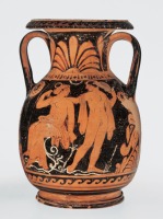 | | Paestumi vörösalakos peliké, Héraklés és nőalak, Rioneróból; Kr. e. 325-300 k. | Ez az egyetlen olyan tárlója a kiállításnak, amelynek anyaga nem múzeumi-művészettörténeti szempontok szerint válogatva került együvé, hanem eredeti leletegyüttest mutat be. A magyar függetlenség kivívására összegyűlt, és az újonnan egyesült Olaszországban Garibaldi vezetésével az indulás alkalmára váró katonák egy ún. segéd-légióba gyűjtve a hegyi rablók (briganti) elleni harcokban vettek részt Dél-Olaszországban. A légió egyik tisztje, Máttyus Izidor tüzér főhadnagy embereivel egy ilyen bevetés során 1861 őszén Rionero közelében, a Lucania (a mai Basilicata tartomány) északi részén, az Appenninek közepén fekvő Vulture-hegy közelében ásatást végzett, amelyen alighanem egy helyi italikus szentély fogadalmi tárgyait találták meg; az anyag a család tulajdonából került a múzeumba. Az ásatás területén az 5. századtól a samnis eredetű lucanusok laktak, akik 420 körül Paestumot is elfoglalták (l. a 7. tárlónál). A terület az Ión-tenger partjának nagy görög városait a Nápolyi- és Salernói-öböl településeivel, Apuliát Campaniával összekötő, a nagy folyóvölgyekben már a bronzkorban kialakult utak kereszteződésénél fekszik. Ennek megfelelően a kiásott leletek Dél-Itália különböző tájairól és kultúráiból származnak. A peliké, főoldalán nász-jelenettel, hátsó oldalán Héraklés és nőalak ábrázolásával a paestumi vörösalakos vázafestészet (l. a 6. tárlót) egyetlen képviselője a gyűjteményben. Belső-lucaniai műhelyben (l. erről a 6. tárlónál) készülhetett a zömök típusú lékythos, rajta a 7. tárló amphoráiról ismert sírjelenettel; ezúttal a síremlék lékythos-alakú, mint a II. terem athéni márvány példánya. A repülő Eróssal díszített epichysis (l. a feketemázas példányt az 5. tárlóban) új ásatások tanúsága szerint Lucania déli partján, metapontioni műhelyben készült. A két további vörösalakos váza apuliai. A hydria két nőalakkal az egyszerű stílus középső korszakából való (l. erről az 5. tárlónál), de valamennyiüknél fontosabb a valamivel későbbi kerek szájú olpé az egyszerű és díszes stílus összeolvadásának idejéből. Jelentőségét nem a vállát díszítő szokványos Erós-nőalak pár adja meg (l. a jobb oldali Panathénaia-amphorát az 5. tárlóban), hanem az aljára hibátlan görög írással festett, a tükörben olvasható felirat; legvalószínűbb értelmezése szerint egy egyébként ismeretlen italikus istenségnek (Pakerioi) szóló dedikáció, akit a váza felajánlói egy számukra lényeges vonásával görög nyelven jelöltek meg: androphyktos (-és?), aki elől a férfiak menekülnek, vagy másik lehetséges értelmezése szerint: aki menekül a férfiak elől. Bennszülött és görög kultúra ugyanilyen keveredését mutatja a négy terrakotta nőalak, a Tanagra-figurák dél-itáliai változatainak már ismert italikus utánzatai (l. a 4. tárlót), és egy töredékes bronz Hercules, Itália nem-görög népei között a görög mitológia legnépszerűbb, nyilván a saját vallási képzeteik alapján értelmezett alakja (l. további italikus bronz szobrait a 9. tárlóban). Apuliai munkának látszik a palmettadíszes guttus (l. a 7. tárlónál). Tarentumi mintakép nyomán készült a kerek dombormű Silénos-fejjel; az eredeti negatív formát nyilvánvalóan antefixeket díszítő reliefek sokszorosítására szánták (l. a terem sarkaiban a falon kiállított sorozatokat), de a rionerói példánynak, amely a tarentumi típus italióta leformázása, sima a hátlapja: nem zárótégláról van letörve, hanem teljes, önálló darab.