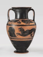 | Etruszk feketealakos amphora oroszlánok közt férfifejjel; Kr. e. 520-500 k. | Az előző tárló késői bucchero-edényei már átvezetnek a 6. század második felébe. A század közepe nagy változások kezdete volt Etruriában. A keleti görögök első, 600 körüli városalapítását a nyugati Mediterráneumban (Massiliában, a mai Marseille-ben) fél század múlva a perzsa birodalom terjeszkedése elől nyugatra menekülők áradata követte. Ezeknek letelepülését az érdekszférájukba eső területen az etruszkok a púnokkal szövetségben meg tudták akadályozni, de tengeri hatalmuk megingott, és súlyos háborúk után 474-ben végképp alulmaradtak a Cumae és Siracusa vezette nyugati görögökkel szemben, miközben 500 táján Róma is sikeresen kelt fel uralmuk ellen. A tengeri kereskedelemből mindinkább kiszorulva az etruszkok észak felé, szárazföldi utakon kerestek új kapcsolatokat. Ennek volt az egyik tünete a belső-etruriai települések fontosságának növekedése, amire az előző tárló végén a Chiusi vezető szerepét tanúsító bucchero-vázák utaltak. A század harmadik negyedében, részben nyilván beköltözött mesterek hatására, a keleti görög művészet hangja vált erősebbé Etruriában, majd egyre inkább az athénié, főleg a feketealakos kerámiáé, amelyet, mint a "tyrrhén" amphorák példája mutatta (l. I. terem, 9. tárló), a század második negyedétől kezdték egyenesen etruszk vevők számára készíteni, és ez a tendencia a század végéig erősödött. Ennek hatása tükröződött a helyi vázafestészetben is, amelyben a század közepétől a feketealakos díszítésmód vált uralkodóvá. Athéni művésznek stílusa alapján is etruszk tanítványa volt a tárló elején álló, kentaur és róka, illetve szarvast leterítő oroszlán jelenetével díszített töredékes, kiegészített amphora mestere, az ún. Borostyánlevél-festő. Az etruszk feketealakos vázafestészet legjelentősebb teljesítménye azonban a Vulciban működő Micali-festő termékeny műhelyének produkciója a század utolsó negyedében és az 5. század elején. A vezető mester két műve a tárló elején nemcsak személyes képességeit, hanem a görög, egyre inkább az athéni vázadíszítés etruszkká alakulásának folyamatát is jól mutatja. Az egykorú görög művészetben ismeretlen motívumok, mint a hydria vállán a szárnyas Gorgó-fej, testén az ökölvívó viadalt eltáncoló alakok - talán halotti játékok szereplői -, köztük a mozgásuk ritmusát kísérő kígyózó vonalakkal, vagy az amphorán körbefutó oroszlánok közt felmerülő férfifej a görög kerámia egyéni hangú és félreismerhetetlenül etruszk tanítványára vallanak.