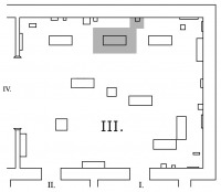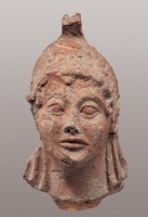 | | Etruszk terrakotta Minerva-fej; Kr. e. 480-470 k. | A magas fülű, talpas tál (kyathos) formája az ő műhelyére utal, díszítése azonban stílusa alapján egy késői követőjének műve, aki a test sziréneit és táncoló bacchánsnőjét, a fül szatír-figuráját a mestertől idegen puszta sziluett-technikával festette az 5. század első negyedében. Athénban ekkor már a vörösalakos technika is fénykorának vége felé járt, de az etruszkok egy évszázadon át idegenkedtek tőle, és a mázra festett, bekarcolással tagolt vörös sziluett-díszítéssel vagyis ál-vörösalakos technikával (l. az 5. tárlót) helyettesítették. Ennek egy példája a tárló másik végében álló hydria harcos búcsúztatásának az egykorú görög kerámiából jól ismert (l. az oszlop-kratért az I. terem 11. tárlójában), stílusában is athéni hatást tükröző jelenetével; a vele rokon ál-vörösalakos vázák, az egyikük görög szignálójáról elnevezett Praxias-csoport edényei Vulciban, a Micali-mesterét folytató műhelyben készültek. A cumaei vereséget megelőző fél század, Etruriában a művészet klasszikus kora, a kerámiánál jelentősebb műfajokban: a monumentális építészetben, a nagyszobrászatban és a nagyfestészetben is kiemelkedő teljesítmények korszaka volt. A nagyszobrászatban rossz minőségű, csak durván faragható kőfajták mellett Dél-Itáliához hasonlóan elsősorban a terrakottát, ritkábban a bronzot használták. A korszak végén, 480-470 táján készült a tárló befelé néző hosszú oldalán látható, szoborhoz vagy szoborcsoporthoz tartozó, életnagyságú Minerva-fej, az etruszk terrakotta-szobrászat jelentős, a korra jellemző fiziognómiai vonásokat mutató példája; az istennő neve itáliai, de az etruszk kultuszban kiemelkedő szerepet játszó alakját a 6. századtól a görög Athénával azonosították, akinek, mint a budapesti fej tanúsítja, ikonográfiai vonásait is átvette. Mellette egy archaikusabb stílust utánzó 19. századi etruszkizáló terrakotta istennő-fej fekszik. A visszanyúlás korábbi korszakok művészetéhez mindig jellemző volt az etruszkokra (így éledt fel a daedalikus stílus egy évszázad múlva az előző tárló két darabján), a görög művészet 5. századi modern irányzatainak példáját pedig - mint a Praxias-hydria kapcsán már kitűnt - csak vonakodva követték, és gyakran archaizálással helyettesítették, ahogy a Minerva-fej mögötti fogadalmi rendeltetésű férfifej mutatja. A mellette kiállított kis sisakos harcos fej annak a hamisítás-hullámnak a tanúja, amely a húszas években a veii Apolló revelációként ható felfedezését követte. Magas szintre jutott a 6. század közepe táján az etruszk bronzművesség. Nagyméretű mesterműveiből kevés maradt fenn, jóval több a szentélyekben elhelyezésre szánt kis bronz fogadalmi szobrokból. Ezek részben a görög archaikus szobrászat típusait követték, gyakran a már említett megkésettséggel, mint a tárló fal felőli oldalán a tábla jobb felső sarkában látható koré (l. az I. terem 7. tárlóját) és a bronzedények közt kiállított kuros mutatja. Figyelmet érdemlő teljesítmény a táblán alul bemutatott, etruszk archaikus stílust utánzó ifjúalak.