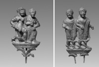 | Két bronzdísz (Héra és Héraklés, a Dioskurok) etruszk edénytartóról; Kr. e. 5. sz. eleje | A bronzedények a kerámiához képest luxusárunak számítottak, de fennmaradt mennyiségük mutatja, hogy széles körben hozzáférhetők voltak. A Micali-vázák mögötti kancsó a tárlóban a legkorábbi példájuk; oroszlán- és két majomfejjel díszített fogójával dél-görögországi típus pontos mása az 525 körüli évekből; a tárló másik végén álló három 5. századi kancsó formája viszont helyben alakult ki. Az oroszlán-figurában végződő fülű kerekszájú olpé típusa egész Etruriában népszerű volt; a mellette álló csőrös kiöntőjű kancsó, nyakán bekarcolt növénydísszel, a 6. század végétől tömegesen az Alpokon túlra exportált etruszk bronztárgyak legjellegzetesebb típusa. A középső tábla bal oldalán látható három finom kidolgozású darabot - egy háromlábú edénytartóról (tripusról) származó két díszt Héra és Héraklés, illetve a Dioskurok alakjával, valamint egy edényfület díszítő, hippokamposon (uszonyban végződő testű lovon) lovagló ifjúalakot - együtt találták a Rajna menti Dürkheimben, ahova az egykorú kereskedelemmel jutottak. Hogy a tengertől elfordulni kényszerülve, ezeknek az áruiknak útvonalait biztosítsák, a 6. század végén az etruszkok Észak felé egészen a Pó torkolatáig kiterjesztették fennhatóságukat; az 5. században elsősorban az itt ekkor hirtelen felvirágzott két város, Adria és Spina közvetítésével tartották fenn a kapcsolatot az Adriai-tengeren északra hajózó görögökkel. Kultúrájuk fénykorában az etruszkok mindennapi élete is új vonások sorával gazdagodott. Erre utal a Micali-vázák mögötti csontból faragott, női kézben végződő két kanál, alighanem kozmetikai használatra, és a tárló befelé néző hosszú oldalán az agyag írótábla, mellette egy bronz íróvesszővel (stylussal), amelynek fogója a terrakotta Minerváéhoz hasonló arcvonásokkal ábrázolt plasztikus ifjúalak; feje a viasszal bevont írótáblára vésett írás törlésére szolgáló lapban végződött. A stylusnak ebben a korban szinte egyedülállóan igényes kivitele az írás megbecsülését mutatja egy korban, mikor az etruszkok közt a görögöktől tanult, majd a kultúrájuk kisugárzási területén Itáliában általuk elterjesztett főníciai betűírás gyakorlata még kiváltságnak számított.