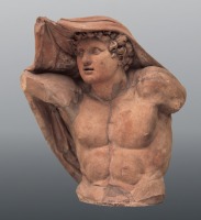 | | Etruszk alabástrom hamvurna fedelén fekvő nőalakkal; Kr. e. 3. sz. vége | A díszítetlen ládájú alabástrom példány Volterra környékén készült a 3. század második felében, a konzolon elhelyezett három agyagurna, főoldalán negatív formából sokszorosított relieffel, a 175-75 közti években Chiusiban. A reliefek stílusán a hellénisztikus kisázsiai művészet hatása érződik; a témák jelentős részét a görög mitológiából vették, máskor helyi mítoszokból, de mindig a halál győzelmes erejére, olykor a héróizmusnak a halál fölötti diadalára utaló értelmezésben, amit a jeleneteket gyakran keretező szárnyas etruszk haláldémonok is aláhúznak. A kiállított urnák egyike szárnyas Gorgó-fejet ábrázol, a középső Eteoklésnek és Polyneikésnek, Oidipus fiainak mindkettőjük halálával végződő párviadalát Théba ostrománál, a harmadik ekével harcoló hérós harcát egy pusztító démon ellen. Hasonló urnák agyagból és kőből az 1. század közepéig készültek, de a 2. század közepe után a halottnak az urna fölső szélére festett vagy vésett, jobbról balra olvasandó etruszk névfeliratát mind gyakrabban latin nyelvű helyettesítette, jelezve Etruria tervszerű romanizálásának befejeződését.