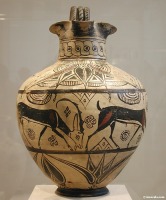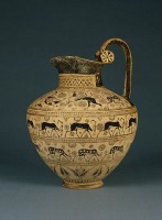 Korai, vagy kísérleti fázisában a továbbélő szubgeometrikus formákat alkalmazza, ábrázolásain megjelennek az állatok, vadkecske, vaddisznó, oroszlán, nyúl, kutya, ritkán vadászjelenet, jellemző a finom és dekoratív hatások keresése. Középső szakaszában lesz a lóherelevél alakú kiöntőjű szélesszájú oinochoé a stílus kedvelt vázaformája (ld. a Szépművészeti Múzeum darabját). Ekkor kerül be a motívumkincsbe a szarvas alakja, és egyre több és sűrűbben elhelyezett térkitöltő motívumot alkalmaznak. Az ábrázolás egyre szabályosabbá, standardizáltabbá válik. A késői korszakban ez a folyamat folytatódik, a kitöltőmotívumok hanyagabbak, formájukat vesztettek lesznek. Ekkor egy jelentős változás is bekövetkezik a produkcióban, ezt a csoportot már nem Milétosban, hanem tőle északabbra Klazomenai zónájában készítik. Az állatalakok megformálása is egyre elnagyoltabb lesz, frissességüket, eredetiségüket elvesztik. A készítési területre beáramló korinthosi kerámia hatására megkezdődik a korinthosi stílus utánzása. A stílus végét szimbolikusan Kr.e. 550 körülre tehetjük. Irodalom: R.M. Cook, Greek painted Pottery, London 1960. R.M. Cook - P. Dupont, East Greek Pottery, London - New York 1998. J. Boardman, Early Greek Vase Painting, London 1998. |