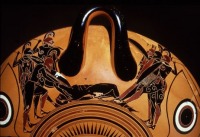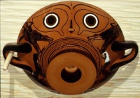 A szempár értelmezését illetően csak feltevéseink lehetnek. Gyakran hallható megoldás szerint bajelhárító jelentőségű lett volna, akárcsak a tondóban megjelenő Gorgó-fő. A szőlőindáktól övezett, átható tekintetű arcrészlet ugyanúgy lehet azonban a bor istenének, Dionysosnak a megjelenési formája is, akit a görög istenalakok közül egyedül láthatunk szemből is ábrázolva az archaikus kori vázafestészetben. Irodalom: J. D. Beazley, The Development of Attic Black-Figure, London 1986. Bencze Ágnes |